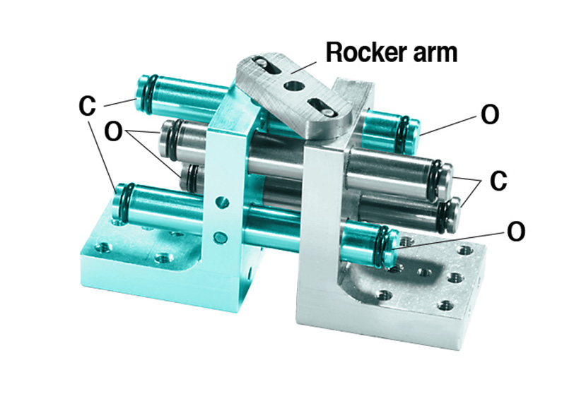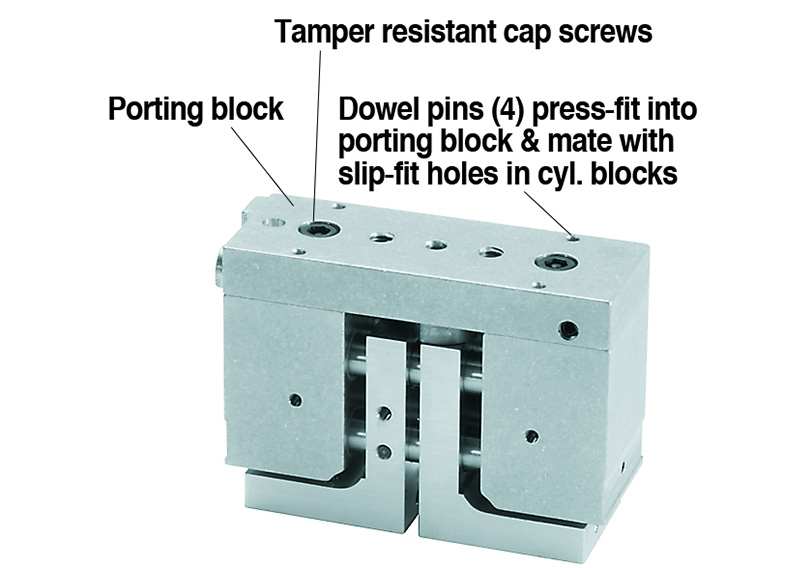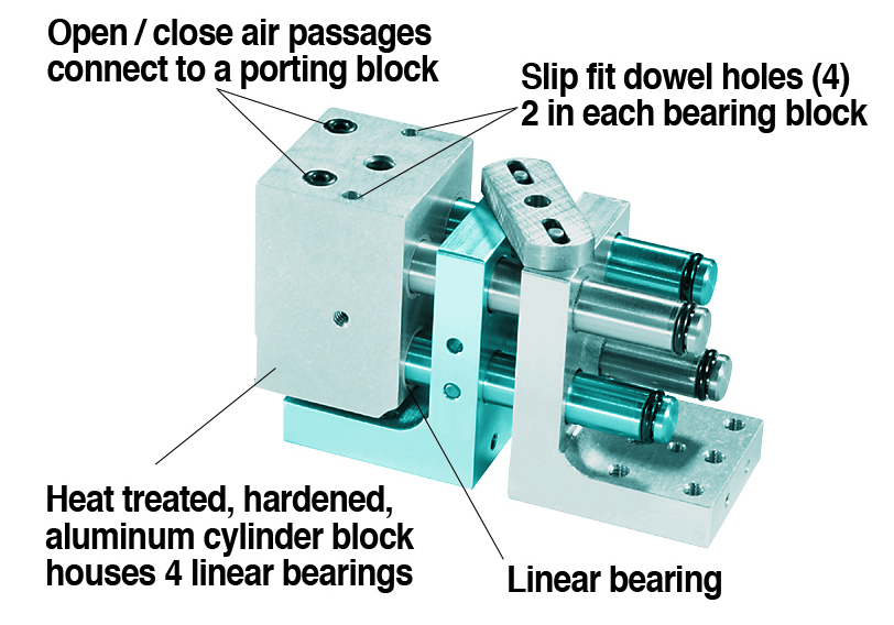 Four cylinders are bored in each of two blocks and connected by internal air passages to the "C" and "O" piston faces. These cylinders incorporate permanently lubricated, high-performance linear bearings that provide clean, drip-proof operation and allow the use of non-lubricated air supply.