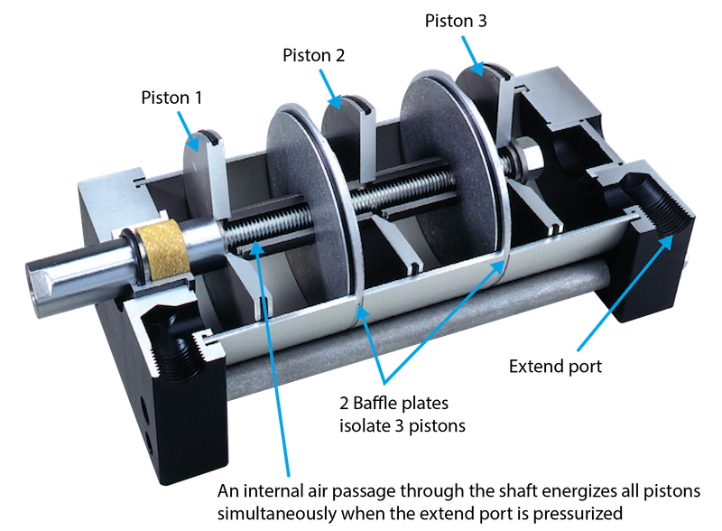 The Multi-Power Principle is a novel design concept in which multiple pistons are attached to a single rod that has integral air channels. The multiple pistons create a larger collective surface area for the air pressure to act on, while pistons are pressurized simultaneously. The result: extraordinary thrust forces at the cylinder rod. Unlike other common methods of increasing the thrust forces of an air cylinder, the multi-piston design doesn’t require increased air pressure or a larger cylinder bore size. This gives you maximum power from the smallest footprint possible. In fact, Multi-Power cylinders can achieve forces up to 22 tons with only 100 psi of shop air. The cylinders also use just one piston to retract, which can allow 22 to 37% air savings.